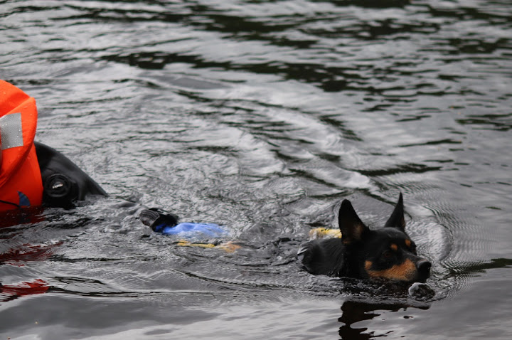 Keskiviikkona keli oli tuulinen, mutta koska myrsky ei sen pahemmin päälle tullut niin pieni joukko urheita suuntasi vepetreeneihin. Tuuli teki hommasta kyllä tosi kylmää kastumisen jälkeen. Vesi sen sijaan tuntui niin lämpöiseltä, että jäätyneitä käsiä pystyi siellä lämmittelemään. Siinä mielessä koirillekin mukavaa ja toki lämmin auto oli ehdon odottelussa.